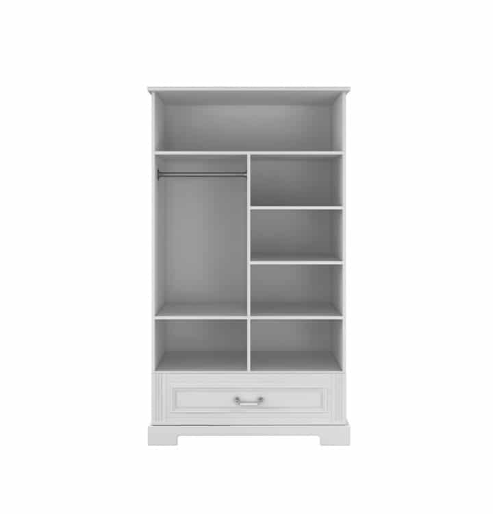 - Achter de deuren vind je 6 ruime opbergvakken waarvan er 3 verstelbaar zijn. De bovenste plank is in de hele lengte van de kast.